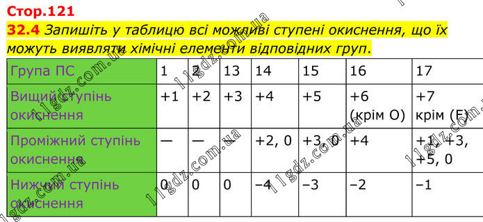 32.4 Запишіть у таблицю всі можливі ступені окиснення, що їх можуть виявляти хімічні елементи відповідних груп. Група ПС 1 2 13 14 15 16 17 Вищий ступінь окиснення +1 +2 +3 +4 +5 +6 (крім О) +7 крім (F) Проміжний ступінь окиснення — — — +2, 0 +3, 0 +4 +1, +3, +5, 0 Нижчий ступінь окиснення 0 0 0 –4 –3 –2 –1