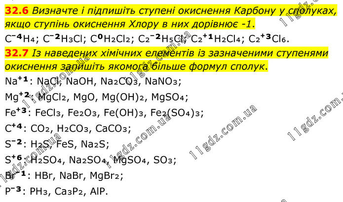 32.6 Визначте і підпишіть ступені окиснення Карбону у сполуках, якщо ступінь окиснення Хлору в них дорівнює -1. C⁻⁴H₄; C⁻²H₃Cl; C⁰H₂Cl₂; C₂⁻²H₅Cl; C₂⁺¹H₂Cl₄; C₂⁺³Cl₆. 32.7 Із наведених хімічних елементів із зазначеними ступенями окиснення запишіть якомога більше формул сполук. Na⁺¹: NaCl, NaOH, Na₂CO₃, NaNO₃; Mg⁺²: MgCl₂, MgO, Mg(OH)₂, MgSO₄; Fe⁺³: FeCl₃, Fe₂O₃, Fe(OH)₃, Fe₂(SO₄)₃; C⁺⁴: CO₂, H₂CO₃, CaCO₃; S⁻²: H₂S, FeS, Na₂S; S⁺⁶: H₂SO₄, Na₂SO₄, MgSO₄, SO₃; Br⁻¹: HBr, NaBr, MgBr₂; P⁻³: PH₃, Ca₃P₂, AlP.