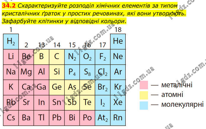 34.2 Схарактеризуйте розподіл хімічних елементів за типом кристалічних ґраток у простих речовинах, які вони утворюють. Зафарбуйте клітинки у відповідні кольори.