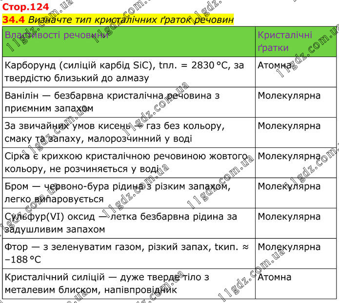 34.4 Визначте тип кристалічних ґраток речовин Властивості речовини Кристалічні ґратки Карборунд (силіцій карбід SiC), tпл. = 2830 °C, за твердістю близький до алмазу Атомна Ванілін — безбарвна кристалічна речовина з приємним запахом Молекулярна За звичайних умов кисень — газ без кольору, смаку та запаху, малорозчинний у воді Молекулярна Сірка є крихкою кристалічною речовиною жовтого кольору, не розчиняється у воді Молекулярна Бром — червоно-бура рідина з різким запахом, легко випаровується Молекулярна Сульфур(VI) оксид — летка безбарвна рідина за задушливим запахом Молекулярна Фтор — з зеленуватим газом, різкий запах, tкип. ≈ –188 °C Молекулярна Кристалічний силіцій — дуже тверде тіло з металевим блиском, напівпровідник Атомна