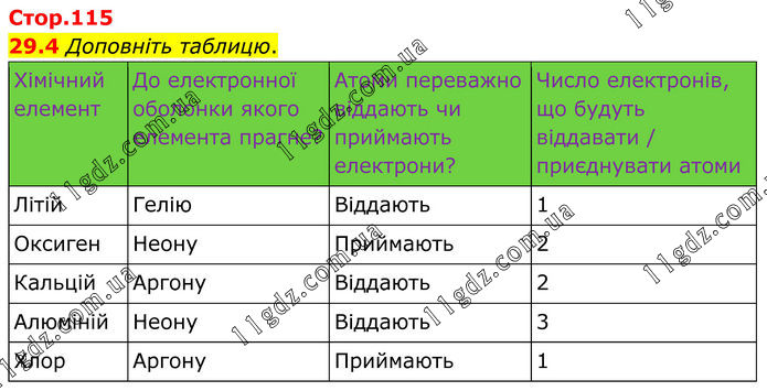 29.4 Доповніть таблицю. Хімічний елемент До електронної оболонки якого елемента прагне? Атоми переважно віддають чи приймають електрони? Число електронів, що будуть віддавати / приєднувати атоми Літій Гелію Віддають 1 Оксиген Неону Приймають 2 Кальцій Аргону Віддають 2 Алюміній Неону Віддають 3 Хлор Аргону Приймають 1