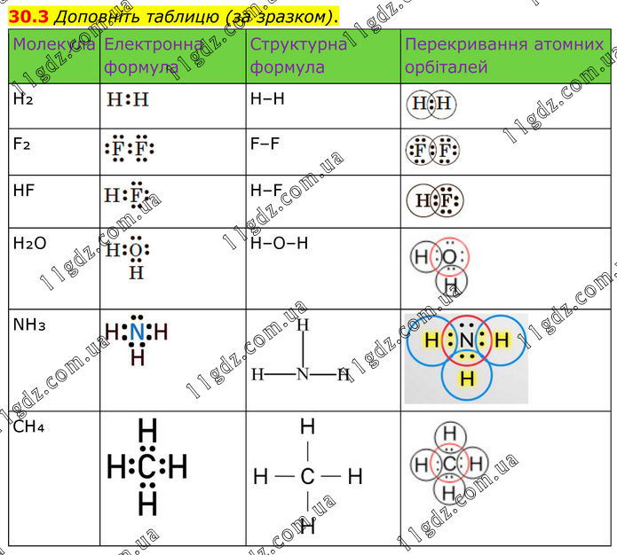 30.3 Доповніть таблицю (за зразком). Молекула Електронна формула Структурна формула Перекривання атомних орбіталей H₂ H–H F₂ F–F HF H–F H₂O H–O–H NH₃ CH₄