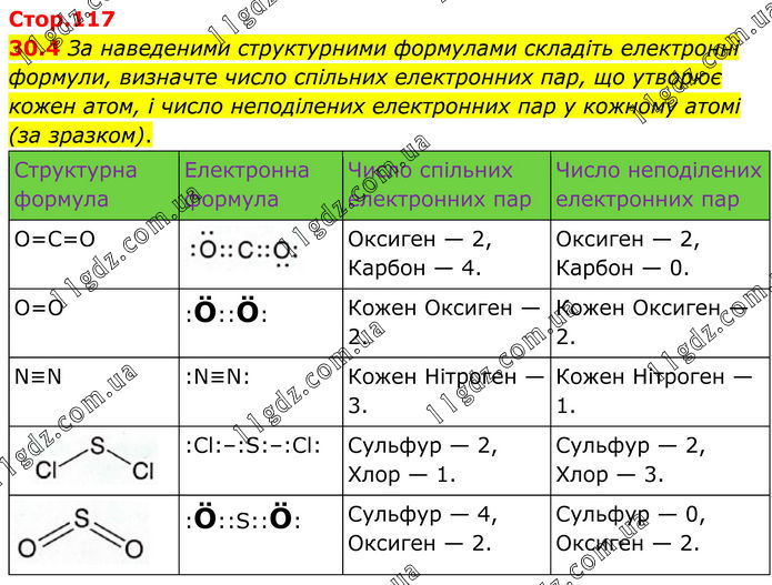 30.4 За наведеними структурними формулами складіть електронні формули, визначте число спільних електронних пар, що утворює кожен атом, і число неподілених електронних пар у кожному атомі (за зразком). Структурна формула Електронна формула Число спільних електронних пар Число неподілених електронних пар O=C=O Оксиген — 2, Карбон — 4. Оксиген — 2, Карбон — 0. O=O :Ö::Ö: Кожен Оксиген — 2. Кожен Оксиген — 2. N≡N :N≡N: Кожен Нітроген — 3. Кожен Нітроген — 1. :Cl:–:S:–:Cl: Сульфур — 2, Хлор — 1. Сульфур — 2, Хлор — 3. :Ö::S::Ö: Сульфур — 4, Оксиген — 2. Сульфур — 0, Оксиген — 2.