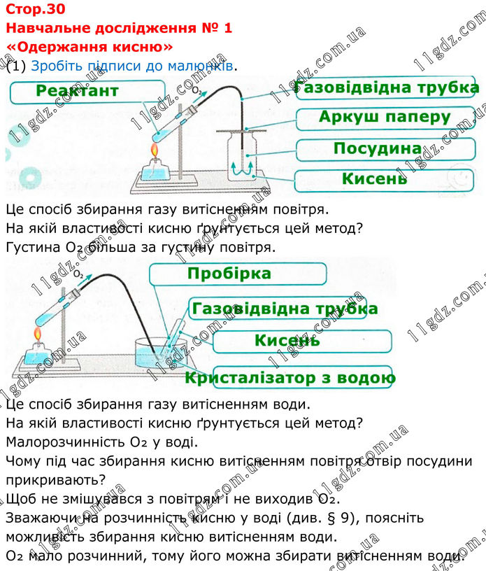 Навчальне дослідження № 1 «Одержання кисню» (1) Зробіть підписи до малюнків. Це спосіб збирання газу витісненням повітря. На якій властивості кисню ґрунтується цей метод? Густина O₂ більша за густину повітря. Це спосіб збирання газу витісненням води. На якій властивості кисню ґрунтується цей метод? Малорозчинність O₂ у воді. Чому під час збирання кисню витісненням повітря отвір посудини прикривають? Щоб не змішувався з повітрям і не виходив O₂. Зважаючи на розчинність кисню у воді (див. § 9), поясніть можливість збирання кисню витісненням води. O₂ мало розчинний, тому його можна збирати витісненням води.