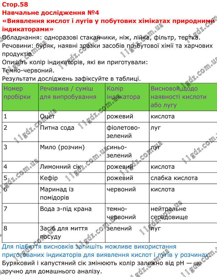 Навчальне дослідження №4 «Виявлення кислот і лугів у побутових хімікатах природними індикаторами» Обладнання: одноразові стаканчики, ніж, лійка, фільтр, тертка. Речовини: буряк, наявні зразки засобів по-бутової хімії та харчових продуктів. Опишіть колір індикаторів, які ви приготували: Темно-червоний. Результати досліджень зафіксуйте в таблиці. Номер пробірки Речовина / суміш для випробування Колір індикатора Висновок щодо наявності кислоти або лугу 1 Оцет рожевий кислота 2 Питна сода фіолетово-зелений луг 3 Мило (розчин) синьо-зелений луг 4 Лимонний сік рожевий кислота 5 Кефір рожевий слабка кислота 6 Маринад із помідорів червоний кислота 7 Вода з-під крана темно-червоний нейтральне середовище 8 Засіб для миття посуду зелений луг Для підбиття висновків запишіть можливе використання приготованих індикаторів для виявлення кислот і лугів у розчинах. Буряковий і капустяний сік змінюють колір залежно від pH — це зручно для домашнього аналізу.