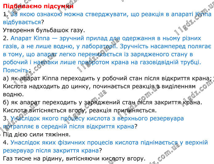 Підбиваємо підсумки 1. За якою ознакою можна стверджувати, що реакція в апараті Кіппа відбувається? Утворення бульбашок газу. 2. Апарат Кіппа — зручний прилад для одержання в ньому різних газів, а не лише водню, у лабораторії. Зручність насамперед полягає в тому, що апарат легко перемикається із зарядженого стану в робочий і навпаки лише поворотом крана на газовідвідній трубці. Поясніть: а) як апарат Кіппа переходить у робочий стан після відкриття крана; Кислота надходить до цинку, починається реакція з виділенням водню. б) як апарат переходить у заряджений стан після закриття крана. Кислота витісняється вгору, реакція припиняється. 3. Унаслідок якого процесу кислота з верхнього резервуара потрапляє в середній після відкриття крана? Під дією сили тяжіння. 4. Унаслідок яких фізичних процесів кислота піднімається у верхній резервуар після закриття крана? Газ тисне на рідину, витісняючи кислоту вгору.