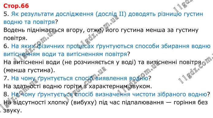 Стор.66 5. Як результати дослідження (дослід II) доводять різницю густин водню та повітря? Водень піднімається вгору, отже, його густина менша за густину повітря. 6. На яких фізичних процесах ґрунтуються способи збирання водню витісненням води та витісненням повітря? На витісненні води (не розчиняється у воді) та витісненні повітря (менша густина). 7. На чому ґрунтується спосіб виявлення водню? На здатності водню горіти з характерним звуком. 8. На чому ґрунтується спосіб визначення чистоти зібраного водню? На відсутності хлопку (вибуху) під час підпалювання — горіння без звуку.