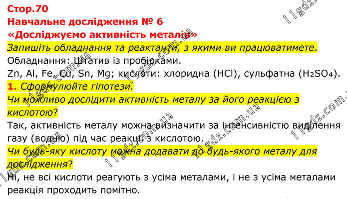 Навчальне дослідження № 6 «Досліджуємо активність металів» Запишіть обладнання та реактанти, з якими ви працюватимете. Обладнання: Штатив із пробірками. Zn, Al, Fe, Cu, Sn, Mg; кислоти: хлоридна (HCl), сульфатна (H₂SO₄). 1. Сформулюйте гіпотези. Чи можливо дослідити активність металу за його реакцією з кислотою? Так, активність металу можна визначити за інтенсивністю виділення газу (водню) під час реакції з кислотою. Чи будь-яку кислоту можна додавати до будь-якого металу для дослідження? Ні, не всі кислоти реагують з усіма металами, і не з усіма металами реакція проходить помітно.