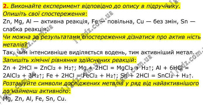 2. Виконайте експеримент відповідно до опису в підручнику. Опишіть свої спостереження: Zn, Mg, Al — активна реакція, Fe — повільна, Cu — без змін, Sn — слабка реакція. Чи можна за результатами спостереження дізнатися про актив ність металів? Так, чим інтенсивніше виділяється водень, тим активніший метал. Запишіть хімічні рівняння здійснених реакцій: Zn + 2HCl = ZnCl₂ + H₂↑; Mg + 2HCl = MgCl₂ + H₂↑; Al + 6HCl = 2AlCl₃ + 3H₂↑; Fe + 2HCl = FeCl₂ + H₂↑; Sn + 2HCl = SnCl₂ + H₂↑. Розташуйте символи досліджених металів у ряд від найактивнішого до найменш активного: Mg, Zn, Al, Fe, Sn, Cu.