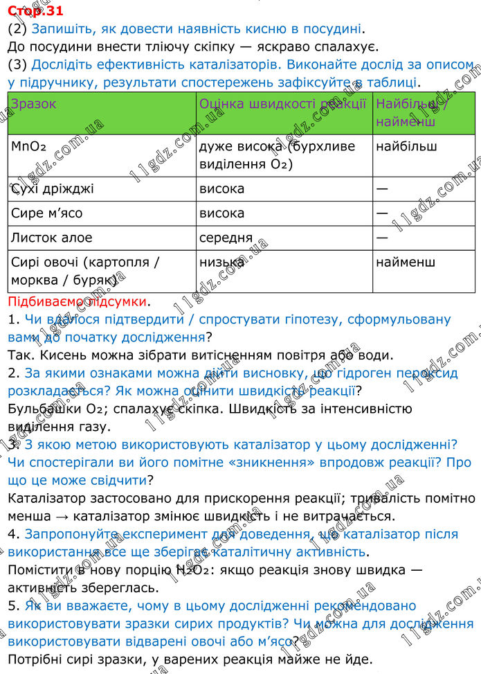 (2) Запишіть, як довести наявність кисню в посудині. До посудини внести тліючу скіпку — яскраво спалахує. (3) Дослідіть ефективність каталізаторів. Виконайте дослід за описом у підручнику, результати спостережень зафіксуйте в таблиці. Зразок Оцінка швидкості реакції Найбільш / найменш MnO₂ дуже висока (бурхливе виділення O₂) найбільш Сухі дріжджі висока — Сире м’ясо висока — Листок алое середня — Сирі овочі (картопля / морква / буряк) низька найменш Підбиваємо підсумки. 1. Чи вдалося підтвердити / спростувати гіпотезу, сформульовану вами до початку дослідження? Так. Кисень можна зібрати витісненням повітря або води. 2. За якими ознаками можна дійти висновку, що гідроген пероксид розкладається? Як можна оцінити швидкість реакції? Бульбашки O₂; спалахує скіпка. Швидкість за інтенсивністю виділення газу. 3. З якою метою використовують каталізатор у цьому дослідженні? Чи спостерігали ви його помітне «зникнення» впродовж реакції? Про що це може свідчити? Каталізатор застосовано для прискорення реакції; тривалість помітно менша → каталізатор змінює швидкість і не витрачається. 4. Запропонуйте експеримент для доведення, що каталізатор після використання все ще зберігає каталітичну активність. Помістити в нову порцію H₂O₂: якщо реакція знову швидка — активність збереглась. 5. Як ви вважаєте, чому в цьому дослідженні рекомендовано використовувати зразки сирих продуктів? Чи можна для дослідження використовувати відварені овочі або м’ясо? Потрібні сирі зразки, у варених реакція майже не йде.