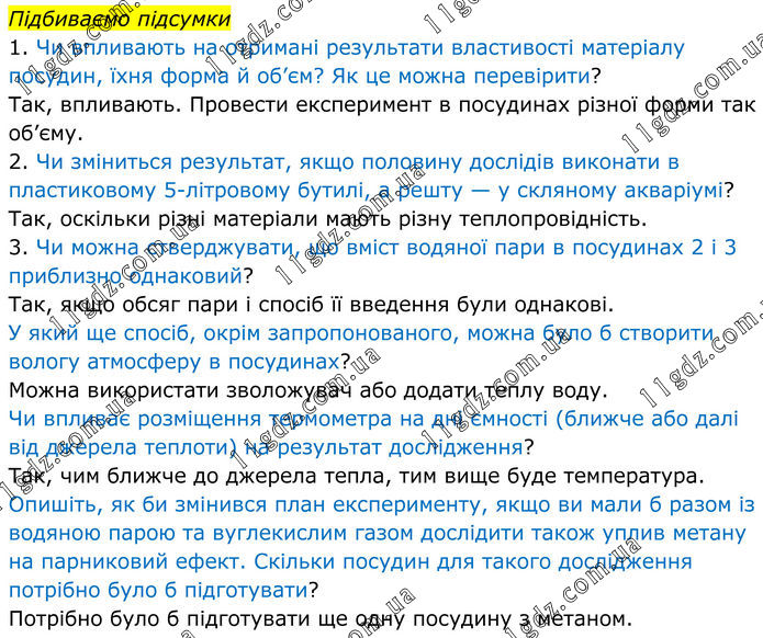 Підбиваємо підсумки 1. Чи впливають на отримані результати властивості матеріалу посудин, їхня форма й об’єм? Як це можна перевірити? Так, впливають. Провести експеримент в посудинах різної форми так об’єму. 2. Чи зміниться результат, якщо половину дослідів виконати в пластиковому 5-літровому бутилі, а решту — у скляному акваріумі? Так, оскільки різні матеріали мають різну теплопровідність. 3. Чи можна стверджувати, що вміст водяної пари в посудинах 2 і 3 приблизно однаковий? Так, якщо обсяг пари і спосіб її введення були однакові. У який ще спосіб, окрім запропонованого, можна було б створити вологу атмосферу в посудинах? Можна використати зволожувач або додати теплу воду. Чи впливає розміщення термометра на дні ємності (ближче або далі від джерела теплоти) на результат дослідження? Так, чим ближче до джерела тепла, тим вище буде температура. Опишіть, як би змінився план експерименту, якщо ви мали б разом із водяною парою та вуглекислим газом дослідити також уплив метану на парниковий ефект. Скільки посудин для такого дослідження потрібно було б підготувати? Потрібно було б підготувати ще одну посудину з метаном.