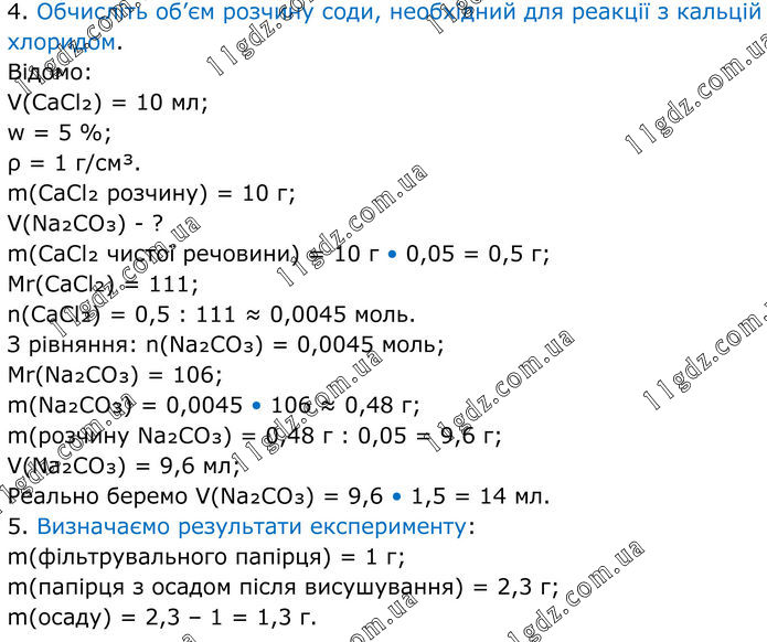 4. Обчисліть об’єм розчину соди, необхідний для реакції з кальцій хлоридом. Відомо: V(CaCl₂) = 10 мл; w = 5 %; ρ = 1 г/см³. m(CaCl₂ розчину) = 10 г; V(Na₂CO₃) - ? m(CaCl₂ чистої речовини) = 10 г • 0,05 = 0,5 г; Mr(CaCl₂) = 111; n(CaCl₂) = 0,5 : 111 ≈ 0,0045 моль. З рівняння: n(Na₂CO₃) = 0,0045 моль; Mr(Na₂CO₃) = 106; m(Na₂CO₃) = 0,0045 • 106 ≈ 0,48 г; m(розчину Na₂CO₃) = 0,48 г : 0,05 = 9,6 г; V(Na₂CO₃) = 9,6 мл; Реально беремо V(Na₂CO₃) = 9,6 • 1,5 = 14 мл. 5. Визначаємо результати експерименту: m(фільтрувального папірця) = 1 г; m(папірця з осадом після висушування) = 2,3 г; m(осаду) = 2,3 – 1 = 1,3 г.