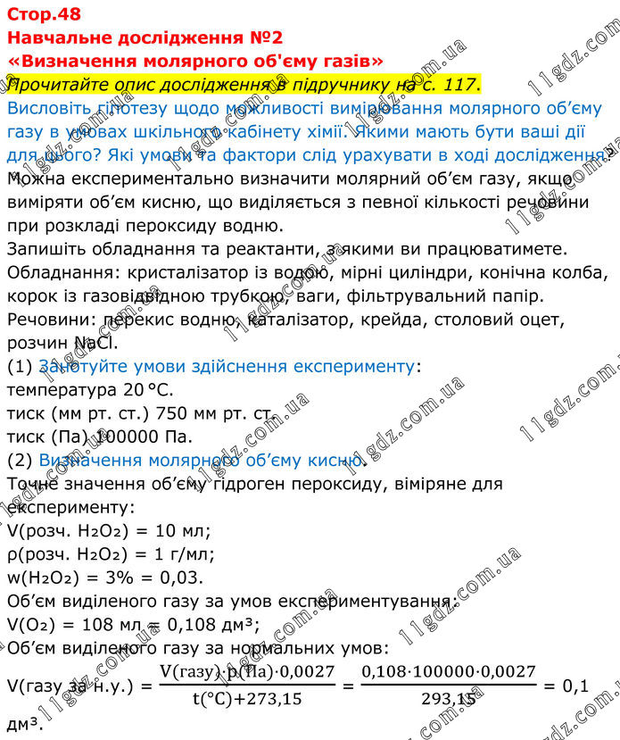 Навчальне дослідження №2 «Визначення молярного об'єму газів» Прочитайте опис дослідження в підручнику на с. 117. Висловіть гіпотезу щодо можливості вимірювання молярного об’єму газу в умовах шкільного кабінету хімії. Якими мають бути ваші дії для цього? Які умови та фактори слід урахувати в ході дослідження? Можна експериментально визначити молярний об’єм газу, якщо виміряти об’єм кисню, що виділяється з певної кількості речовини при розкладі пероксиду водню. Запишіть обладнання та реактанти, з якими ви працюватимете. Обладнання: кристалізатор із водою, мірні циліндри, конічна колба, корок із газовідвідною трубкою, ваги, фільтрувальний папір. Речовини: перекис водню, каталізатор, крейда, столовий оцет, розчин NaCl. (1) Занотуйте умови здійснення експерименту: температура 20 °C. тиск (мм рт. ст.) 750 мм рт. ст. тиск (Па) 100000 Па. (2) Визначення молярного об’єму кисню. Точне значення об’єму гідроген пероксиду, віміряне для експерименту: V(розч. H₂O₂) = 10 мл; ρ(розч. H₂O₂) = 1 г/мл; w(H₂O₂) = 3% = 0,03. Об’єм виділеного газу за умов експериментування: V(O₂) = 108 мл = 0,108 дм³; Об’єм виділеного газу за нормальних умов: V(газу за н.у.) = (V(газу)⋅p(Па)⋅0,0027)/(t(°C)+273,15) = (0,108⋅100000⋅0,0027)/293,15 = 0,1 дм³.