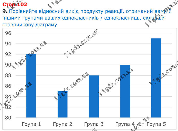 9. Порівняйте відносний вихід продукту реакції, отриманий вами й іншими групами ваших однокласників / однокласниць, склавши стовпчикову діаграму.