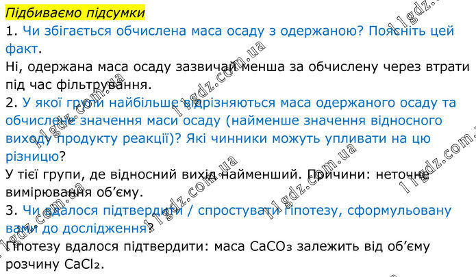Підбиваємо підсумки 1. Чи збігається обчислена маса осаду з одержаною? Поясніть цей факт. Ні, одержана маса осаду зазвичай менша за обчислену через втрати під час фільтрування. 2. У якої групи найбільше відрізняються маса одержаного осаду та обчислене значення маси осаду (найменше значення відносного виходу продукту реакції)? Які чинники можуть упливати на цю різницю? У тієї групи, де відносний вихід найменший. Причини: неточне вимірювання об’єму. 3. Чи вдалося підтвердити / спростувати гіпотезу, сформульовану вами до дослідження? Гіпотезу вдалося підтвердити: маса CaCO₃ залежить від об’єму розчину CaCl₂.