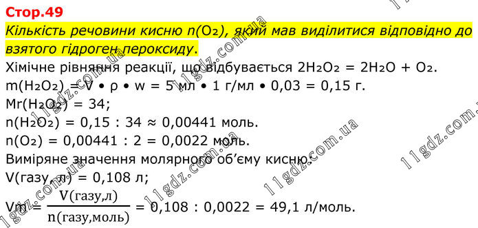 Кількість речовини кисню n(O₂), який мав виділитися відповідно до взятого гідроген пероксиду. Хімічне рівняння реакції, що відбувається 2H₂O₂ = 2H₂O + O₂. m(H₂O₂) = V • ρ • w = 5 мл • 1 г/мл • 0,03 = 0,15 г. Mr(H₂O₂) = 34; n(H₂O₂) = 0,15 : 34 ≈ 0,00441 моль. n(O₂) = 0,00441 : 2 = 0,0022 моль. Виміряне значення молярного об’єму кисню: V(газу, л) = 0,108 л; Vm = (V(газу,л))/(n(газу,моль)) = 0,108 : 0,0022 = 49,1 л/моль.