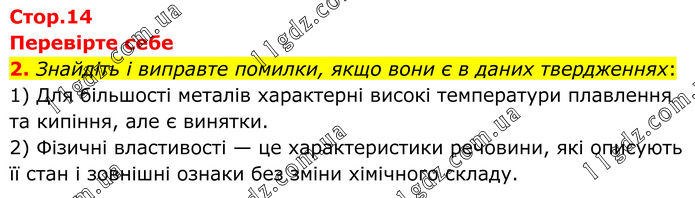 Перевірте себе 2. Знайдіть і виправте помилки, якщо вони є в даних твердженнях: 1) Для більшості металів характерні високі температури плавлення та кипіння, але є винятки. 2) Фізичні властивості — це характеристики речовини, які описують її стан і зовнішні ознаки без зміни хімічного складу.