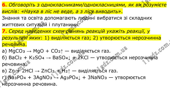 6. Обговоріть з однокласниками/однокласницями, як ви розумієте вислів: «Наука в ліс не веде, а з лісу виводить». Знання та освіта допомагають людині вибратися зі складних життєвих ситуацій і плутанини. 7. Серед наведених схем рівнянь реакцій укажіть реакції, у результаті яких: 1) виділяється газ; 2) утворюється нерозчинна речовина. а) MgCO₃ → MgO + CO₂↑ — виділяється газ. б) BaCl₂ + K₂SO₄ → BaSO₄↓ + 2KCl — утворюється нерозчинна речовина. в) Zn + 2HCl → ZnCl₂ + H₂↑ — виділяється газ. г) Na₃PO₄ + 3AgNO₃ → Ag₃PO₄↓ + 3NaNO₃ — утворюється нерозчинна речовина.