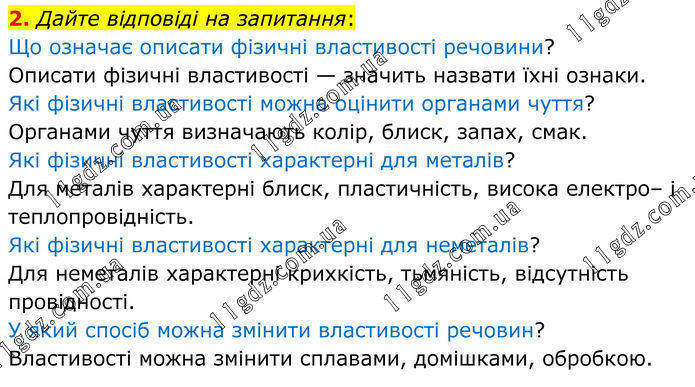 2. Дайте відповіді на запитання: Що означає описати фізичні властивості речовини? Описати фізичні властивості — значить назвати їхні ознаки. Які фізичні властивості можна оцінити органами чуття? Органами чуття визначають колір, блиск, запах, смак. Які фізичні властивості характерні для металів? Для металів характерні блиск, пластичність, висока електро– і теплопровідність. Які фізичні властивості характерні для неметалів? Для неметалів характерні крихкість, тьмяність, відсутність провідності. У який спосіб можна змінити властивості речовин? Властивості можна змінити сплавами, домішками, обробкою.
