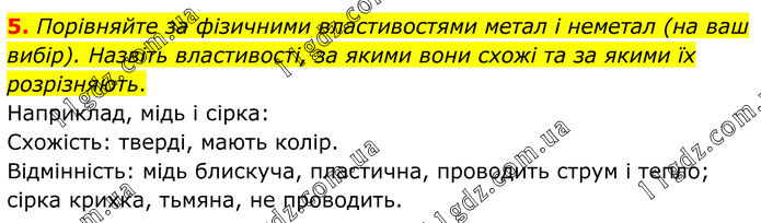 5. Порівняйте за фізичними властивостями метал і неметал (на ваш вибір). Назвіть властивості, за якими вони схожі та за якими їх розрізняють. Наприклад, мідь і сірка: Схожість: тверді, мають колір. Відмінність: мідь блискуча, пластична, проводить струм і тепло; сірка крихка, тьмяна, не проводить.