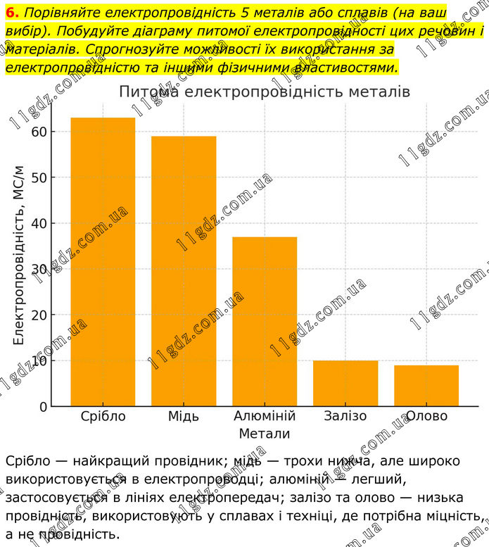 6. Порівняйте електропровідність 5 металів або сплавів (на ваш вибір). Побудуйте діаграму питомої електропровідності цих речовин і матеріалів. Спрогнозуйте можливості їх використання за електропровідністю та іншими фізичними властивостями. Срібло — найкращий провідник; мідь — трохи нижча, але широко використовується в електропроводці; алюміній — легший, застосовується в лініях електропередач; залізо та олово — низька провідність, використовують у сплавах і техніці, де потрібна міцність, а не провідність.