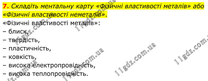 7. Складіть ментальну карту «Фізичні властивості металів» або «Фізичні властивості неметалів». «Фізичні властивості металів»: – блиск, – твердість, – пластичність, – ковкість, – висока електропровідність, – висока теплопровідність.