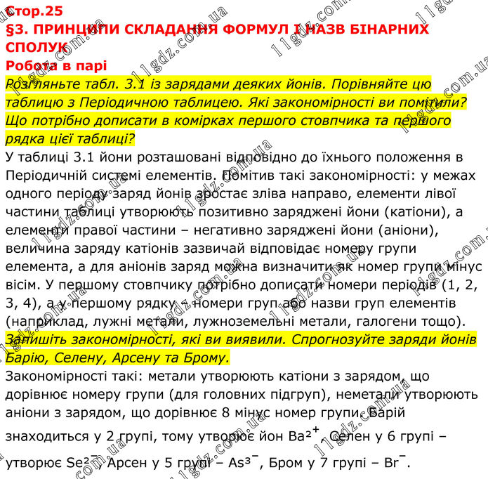 §3. ПРИНЦИПИ СКЛАДАННЯ ФОРМУЛ І НАЗВ БІНАРНИХ СПОЛУК Робота в парі Розгляньте табл. 3.1 із зарядами деяких йонів. Порівняйте цю таблицю з Періодичною таблицею. Які закономірності ви помітили? Що потрібно дописати в комірках першого стовпчика та першого рядка цієї таблиці? У таблиці 3.1 йони розташовані відповідно до їхнього положення в Періодичній системі елементів. Помітив такі закономірності: у межах одного періоду заряд йонів зростає зліва направо, елементи лівої частини таблиці утворюють позитивно заряджені йони (катіони), а елементи правої частини – негативно заряджені йони (аніони), величина заряду катіонів зазвичай відповідає номеру групи елемента, а для аніонів заряд можна визначити як номер групи мінус вісім. У першому стовпчику потрібно дописати номери періодів (1, 2, 3, 4), а у першому рядку – номери груп або назви груп елементів (наприклад, лужні метали, лужноземельні метали, галогени тощо). Запишіть закономірності, які ви виявили. Спрогнозуйте заряди йонів Барію, Селену, Арсену та Брому. Закономірності такі: метали утворюють катіони з зарядом, що дорівнює номеру групи (для головних підгруп), неметали утворюють аніони з зарядом, що дорівнює 8 мінус номер групи. Барій знаходиться у 2 групі, тому утворює йон Ba²⁺, Селен у 6 групі – утворює Se²⁻, Арсен у 5 групі – As³⁻, Бром у 7 групі – Br⁻.