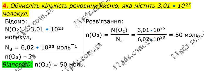 4. Обчисліть кількість речовини кисню, яка містить 3,01 • 10²⁵ молекул. Відомо: N(O₂) = 3,01 • 10²⁵ молекул, Nₐ = 6,02 • 10²³ моль⁻¹ Розв'язання: n(O₂) = (N(O₂) )/(Nₐ ) = (3,01 • 10²⁵ )/(6,02 • 10²³ ) = 50 моль. n(O₂) – ? Відповідь: n(O₂) = 50 моль.