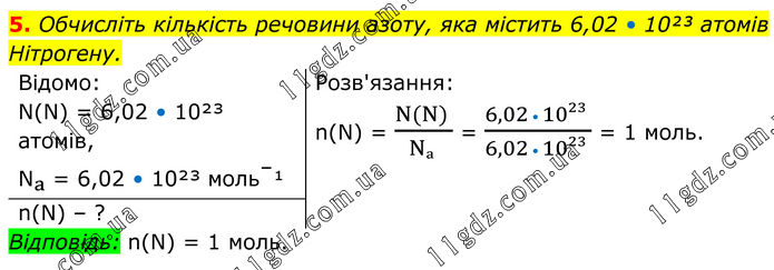 5. Обчисліть кількість речовини азоту, яка містить 6,02 • 10²³ атомів Нітрогену. Відомо: N(N) = 6,02 • 10²³ атомів, Nₐ = 6,02 • 10²³ моль⁻¹ Розв'язання: n(N) = (N(N) )/(Nₐ ) = (6,02 • 10²³ )/(6,02 • 10²³ ) = 1 моль. n(N) – ? Відповідь: n(N) = 1 моль.