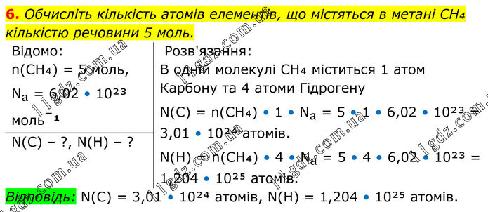 6. Обчисліть кількість атомів елементів, що містяться в метані CH₄ кількістю речовини 5 моль. Відомо: n(CH₄) = 5 моль, Nₐ = 6,02 • 10²³ моль⁻¹ Розв'язання: В одній молекулі CH₄ міститься 1 атом Карбону та 4 атоми Гідрогену N(C) = n(CH₄) • 1 • Nₐ = 5 • 1 • 6,02 • 10²³ = 3,01 • 10²⁴ атомів. N(H) = n(CH₄) • 4 • Nₐ = 5 • 4 • 6,02 • 10²³ = 1,204 • 10²⁵ атомів. N(C) – ?, N(H) – ? Відповідь: N(C) = 3,01 • 10²⁴ атомів, N(H) = 1,204 • 10²⁵ атомів.