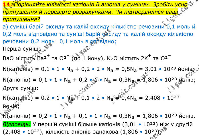11. Порівняйте кількості катіонів й аніонів у сумішах. Зробіть усно припущення й перевірте розрахунками. Чи підтвердилися ваші припущення? а) суміші барій оксиду та калій оксиду кількістю речовини 0,1 моль й 0,2 моль відповідно та суміші барій оксиду та калій оксиду кількістю речовини 0,2 моль і 0,1 моль відповідно; Перша суміш: BaO містить Ba²⁺ та O²⁻ (по 1 йону), K₂O містить 2K⁺ та O²⁻ N(катіонів) = 0,1 • 1 • Nₐ + 0,2 • 2 • Nₐ = 0,5Nₐ = 3,01 • 10²³ йонів; N(аніонів) = 0,1 • 1 • Nₐ + 0,2 • 1 • Nₐ = 0,3Nₐ = 1,806 • 10²³ йонів; Друга суміш: N(катіонів) = 0,2 • 1 • Nₐ + 0,1 • 2 • Nₐ = 0,4Nₐ = 2,408 • 10²³ йонів; N(аніонів) = 0,2 • 1 • Nₐ + 0,1 • 1 • Nₐ = 0,3Nₐ = 1,806 • 10²³ йонів. Відповідь: У першій суміші більше катіонів (3,01 • 10²³) ніж у другій (2,408 • 10²³), кількість аніонів однакова (1,806 • 10²³).