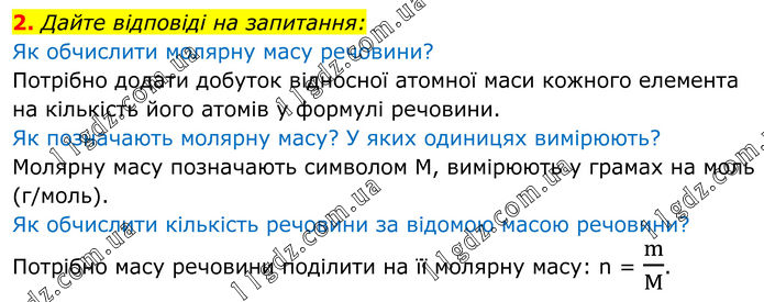 2. Дайте відповіді на запитання: Як обчислити молярну масу речовини? Потрібно додати добуток відносної атомної маси кожного елемента на кількість його атомів у формулі речовини. Як позначають молярну масу? У яких одиницях вимірюють? Молярну масу позначають символом М, вимірюють у грамах на моль (г/моль). Як обчислити кількість речовини за відомою масою речовини? Потрібно масу речовини поділити на її молярну масу: n = m/M.