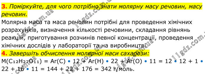3. Поміркуйте, для чого потрібно знати молярну масу речовин, масу речовин. Молярна маса та маса речовин потрібні для проведення хімічних розрахунків, визначення кількості речовини, складання рівнянь реакцій, приготування розчинів певної концентрації, проведення хімічних дослідів у лабораторії та на виробництві. 4. Завершіть обчислення молярної маси сахарози: M(C₁₂H₂₂O₁₁) = Ar(C) • 12 + Ar(H) • 22 + Ar(O) • 11 = 12 • 12 + 1 • 22 + 16 • 11 = 144 + 22 + 176 = 342 г/моль.