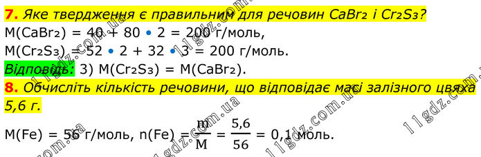 7. Яке твердження є правильним для речовин CaBr₂ і Cr₂S₃? M(CaBr₂) = 40 + 80 • 2 = 200 г/моль, M(Cr₂S₃) = 52 • 2 + 32 • 3 = 200 г/моль. Відповідь: 3) M(Cr₂S₃) = M(CaBr₂). 8. Обчисліть кількість речовини, що відповідає масі залізного цвяха 5,6 г. M(Fe) = 56 г/моль, n(Fe) = m/(M ) = 5,6/56 = 0,1 моль.