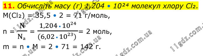 11. Обчисліть масу (г) 1,204 • 10²⁴ молекул хлору Cl₂. M(Cl₂) = 35,5 • 2 = 71 г/моль, n = N/(Nₐ ) = (1,204 • 10²⁴)/((6,02 • 10²³) )= 2 моль, m = n • M = 2 • 71 = 142 г.