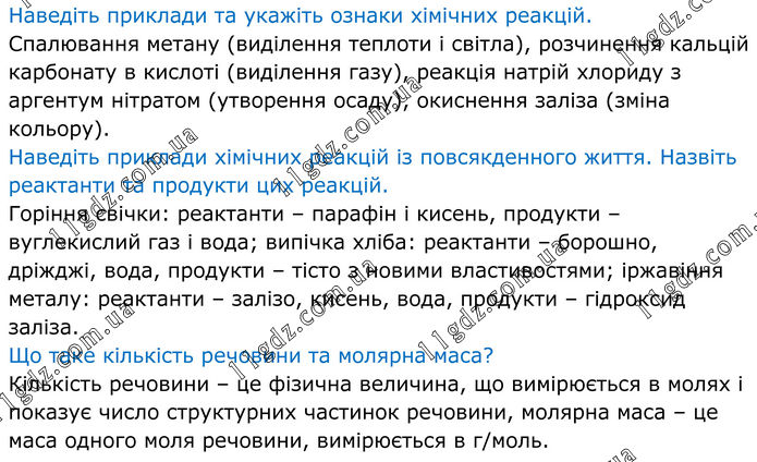 Наведіть приклади та укажіть ознаки хімічних реакцій. Спалювання метану (виділення теплоти і світла), розчинення кальцій карбонату в кислоті (виділення газу), реакція натрій хлориду з аргентум нітратом (утворення осаду), окиснення заліза (зміна кольору). Наведіть приклади хімічних реакцій із повсякденного життя. Назвіть реактанти та продукти цих реакцій. Горіння свічки: реактанти – парафін і кисень, продукти – вуглекислий газ і вода; випічка хліба: реактанти – борошно, дріжджі, вода, продукти – тісто з новими властивостями; іржавіння металу: реактанти – залізо, кисень, вода, продукти – гідроксид заліза. Що таке кількість речовини та молярна маса? Кількість речовини – це фізична величина, що вимірюється в молях і показує число структурних частинок речовини, молярна маса – це маса одного моля речовини, вимірюється в г/моль.
