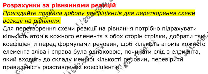 Розрахунки за рівняннями реакцій Пригадайте правила добору коефіцієнтів для перетворення схеми реакції на рівняння. Для перетворення схеми реакції на рівняння потрібно підрахувати кількість атомів кожного елемента з обох сторін стрілки, добрати такі коефіцієнти перед формулами речовин, щоб кількість атомів кожного елемента зліва і справа була однаковою, починати слід з елемента, який входить до складу меншої кількості речовин, перевірити правильність розставлених коефіцієнтів.