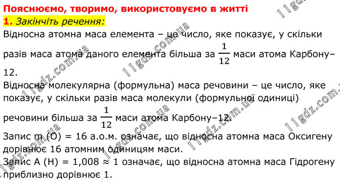 Пояснюємо, творимо, використовуємо в житті 1. Закінчіть речення: Відносна атомна маса елемента – це число, яке показує, у скільки разів маса атома даного елемента більша за 1/12 маси атома Карбону–12. Відносна молекулярна (формульна) маса речовини – це число, яке показує, у скільки разів маса молекули (формульної одиниці) речовини більша за 1/12 маси атома Карбону–12. Запис m (O) = 16 а.о.м. означає, що відносна атомна маса Оксигену дорівнює 16 атомним одиницям маси. Запис A (H) = 1,008 ≈ 1 означає, що відносна атомна маса Гідрогену приблизно дорівнює 1.