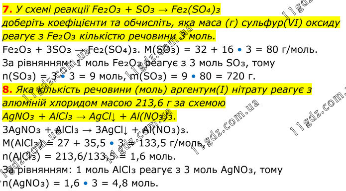 7. У схемі реакції Fe₂O₃ + SO₃ → Fe₂(SO₄)₃ доберіть коефіцієнти та обчисліть, яка маса (г) сульфур(VI) оксиду реагує з Fe₂O₃ кількістю речовини 3 моль. Fe₂O₃ + 3SO₃ → Fe₂(SO₄)₃. M(SO₃) = 32 + 16 • 3 = 80 г/моль. За рівнянням: 1 моль Fe₂O₃ реагує з 3 моль SO₃, тому n(SO₃) = 3 • 3 = 9 моль, m(SO₃) = 9 • 80 = 720 г. 8. Яка кількість речовини (моль) аргентум(І) нітрату реагує з алюміній хлоридом масою 213,6 г за схемою AgNO₃ + AlCl₃ → AgCl↓ + Al(NO₃)₃. 3AgNO₃ + AlCl₃ → 3AgCl↓ + Al(NO₃)₃. M(AlCl₃) = 27 + 35,5 • 3 = 133,5 г/моль, n(AlCl₃) = 213,6/133,5 = 1,6 моль. За рівнянням: 1 моль AlCl₃ реагує з 3 моль AgNO₃, тому n(AgNO₃) = 1,6 • 3 = 4,8 моль.
