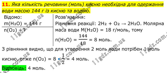 11. Яка кількість речовини (моль) кисню необхідна для одержання води масою 144 г із кисню та водню. Відомо: m(H₂O) = 144 г Розв'язання: Рівняння реакції: 2H₂ + O₂ → 2H₂O. Молярна маса води M(H₂O) = 18 г/моль, тому n(H₂O) = 144/18 = 8 моль. n(O₂) – ? З рівняння видно, що для утворення 2 моль води потрібен 1 моль кисню, отже n(O₂) = 8 • 1/2 =
