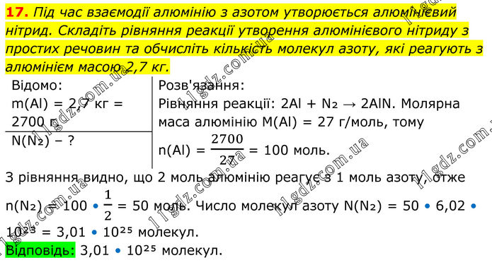 17. Під час взаємодії алюмінію з азотом утворюється алюмінієвий нітрид. Складіть рівняння реакції утворення алюмінієвого нітриду з простих речовин та обчисліть кількість молекул азоту, які реагують з алюмінієм масою 2,7 кг. Відомо: m(Al) = 2,7 кг = 2700 г. Розв'язання: Рівняння реакції: 2Al + N₂ → 2AlN. Молярна маса алюмінію M(Al) = 27 г/моль, тому n(Al) = 2700/27 = 100 моль. N(N₂) – ? З рівняння видно, що 2 моль алюмінію реагує з 1 моль азоту, отже n(N₂) = 100 • 1/2 = 50 моль. Число молекул азоту N(N₂) = 50 • 6,02 • 10²³ = 3,01 • 10²⁵ молекул. Відповідь: 3,01 • 10²⁵ молекул.