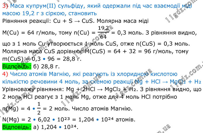 3) Маса купрум(II) сульфіду, який одержали під час взаємодії міді масою 19,2 г з сіркою, становить Рівняння реакції: Cu + S → CuS. Молярна маса міді M(Cu) = 64 г/моль, тому n(Cu) = 19,2/64 = 0,3 моль. З рівняння видно, що з 1 моль Cu утворюється 1 моль CuS, отже n(CuS) = 0,3 моль. Молярна маса CuS дорівнює M(CuS) = 64 + 32 = 96 г/моль, тому m(CuS) = 0,3 • 96 = 28,8 г. Відповідь: б) 28,8 г. 4) Число атомів Магнію, які реагують із хлоридною кислотою кількістю речовини 4 моль, за схемою реакції Mg + HCl → MgCl₂ + H₂ Урівноважу рівняння: Mg + 2HCl → MgCl₂ + H₂. З рівняння видно, що 2 моль HCl реагує з 1 моль Mg, отже для 4 моль HCl потрібно n(Mg) = 4 • 1/2 = 2 моль. Число атомів Магнію. N(Mg) = 2 • 6,02 • 10²³ = 1,204 • 10²⁴ атомів. Відповідь: а) 1,204 • 10²⁴.