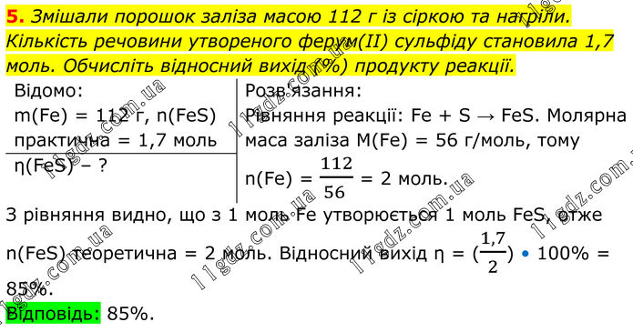 5. Змішали порошок заліза масою 112 г із сіркою та нагріли. Кількість речовини утвореного ферум(II) сульфіду становила 1,7 моль. Обчисліть відносний вихід (%) продукту реакції. Відомо: m(Fe) = 112 г, n(FeS) практична = 1,7 моль Розв'язання: Рівняння реакції: Fe + S → FeS. Молярна маса заліза M(Fe) = 56 г/моль, тому n(Fe) = 112/(56 ) = 2 моль. η(FeS) – ? З рівняння видно, що з 1 моль Fe утворюється 1 моль FeS, отже n(FeS) теоретична = 2 моль. Відносний вихід η = (1,7/2) • 100% = 85%. Відповідь: 85%.
