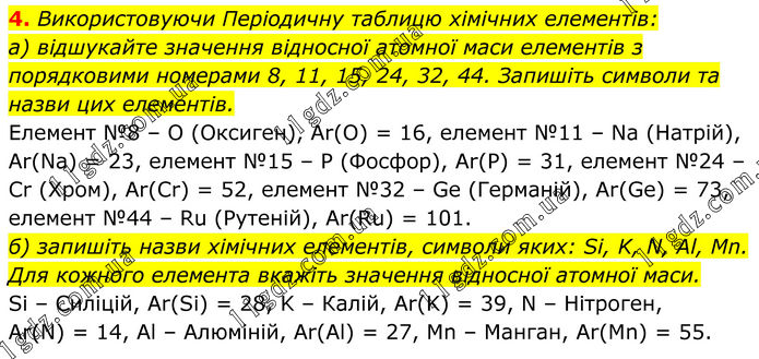 4. Використовуючи Періодичну таблицю хімічних елементів: а) відшукайте значення відносної атомної маси елементів з порядковими номерами 8, 11, 15, 24, 32, 44. Запишіть символи та назви цих елементів. Елемент №8 – O (Оксиген), Ar(O) = 16, елемент №11 – Na (Натрій), Ar(Na) = 23, елемент №15 – P (Фосфор), Ar(P) = 31, елемент №24 – Cr (Хром), Ar(Cr) = 52, елемент №32 – Ge (Германій), Ar(Ge) = 73, елемент №44 – Ru (Рутеній), Ar(Ru) = 101. б) запишіть назви хімічних елементів, символи яких: Si, K, N, Al, Mn. Для кожного елемента вкажіть значення відносної атомної маси. Si – Силіцій, Ar(Si) = 28, K – Калій, Ar(K) = 39, N – Нітроген, Ar(N) = 14, Al – Алюміній, Ar(Al) = 27, Mn – Манган, Ar(Mn) = 55.