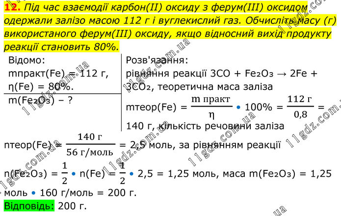 12. Під час взаємодії карбон(ІІ) оксиду з ферум(ІІІ) оксидом одержали залізо масою 112 г і вуглекислий газ. Обчисліть масу (г) використаного ферум(ІІІ) оксиду, якщо відносний вихід продукту реакції становить 80%. Відомо: mпракт(Fe) = 112 г, η(Fe) = 80%. Розв'язання: рівняння реакції 3CO + Fe₂O₃ → 2Fe + 3CO₂, теоретична маса заліза mтеор(Fe) = (m практ )/( η ) • 100% = (112 г )/( 0,8 ) = 140 г, кількість речовини заліза m(Fe₂O₃) – ? nтеор(Fe) = (140 г )/(56 г/моль ) = 2,5 моль, за рівнянням реакції n(Fe₂O₃) = 1/2 • n(Fe) = 1/2 • 2,5 = 1,25 моль, маса m(Fe₂O₃) = 1,25 моль • 160 г/моль = 200 г. Відповідь: 200 г.