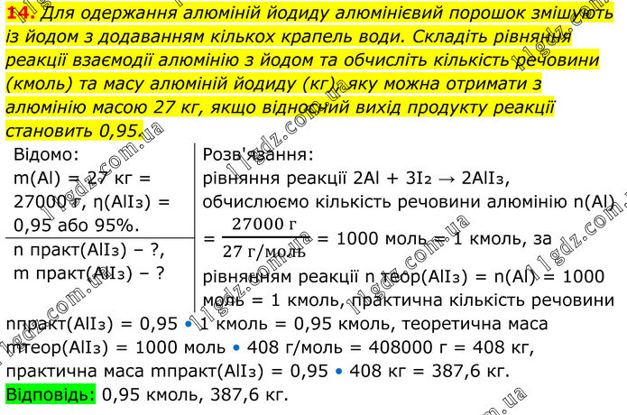 14. Для одержання алюміній йодиду алюмінієвий порошок змішують із йодом з додаванням кількох крапель води. Складіть рівняння реакції взаємодії алюмінію з йодом та обчисліть кількість речовини (кмоль) та масу алюміній йодиду (кг), яку можна отримати з алюмінію масою 27 кг, якщо відносний вихід продукту реакції становить 0,95. Відомо: m(Al) = 27 кг = 27000 г, η(AlI₃) = 0,95 або 95%. Розв'язання: рівняння реакції 2Al + 3I₂ → 2AlI₃, обчислюємо кількість речовини алюмінію n(Al) = (27000 г )/(27 г/моль ) = 1000 моль = 1 кмоль, за рівнянням реакції n теор(AlI₃) = n(Al) = 1000 моль = 1 кмоль, практична кількість речовини nпракт(AlI₃) – ?, mпракт(AlI₃) – ? nпракт(AlI₃) = 0,95 • 1 кмоль = 0,95 кмоль, теоретична маса mтеор(AlI₃) = 1000 моль • 408 г/моль = 408000 г = 408 кг, практична маса mпракт(AlI₃) = 0,95 • 408 кг = 387,6 кг. Відповідь: 0,95 кмоль, 387,6 кг.