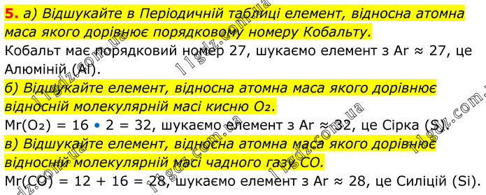 5. а) Відшукайте в Періодичній таблиці елемент, відносна атомна маса якого дорівнює порядковому номеру Кобальту. Кобальт має порядковий номер 27, шукаємо елемент з Ar ≈ 27, це Алюміній (Al). б) Відшукайте елемент, відносна атомна маса якого дорівнює відносній молекулярній масі кисню O₂. Mr(O₂) = 16 • 2 = 32, шукаємо елемент з Ar ≈ 32, це Сірка (S). в) Відшукайте елемент, відносна атомна маса якого дорівнює відносній молекулярній масі чадного газу CO. Mr(CO) = 12 + 16 = 28, шукаємо елемент з Ar ≈ 28, це Силіцій (Si).