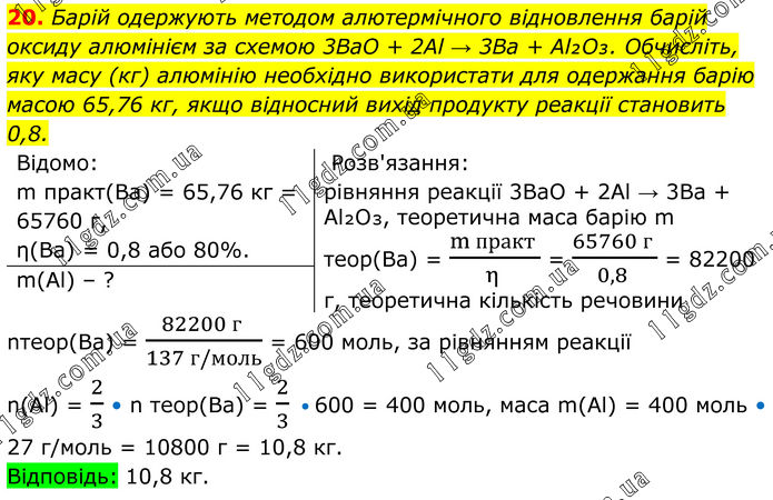 20. Барій одержують методом алютермічного відновлення барій оксиду алюмінієм за схемою 3BaO + 2Al → 3Ba + Al₂O₃. Обчисліть, яку масу (кг) алюмінію необхідно використати для одержання барію масою 65,76 кг, якщо відносний вихід продукту реакції становить 0,8. Відомо: m практ(Ba) = 65,76 кг = 65760 г, η(Ba) = 0,8 або 80%. Розв'язання: рівняння реакції 3BaO + 2Al → 3Ba + Al₂O₃, теоретична маса барію m теор(Ba) = (m практ )/(η ) = (65760 г )/(0,8 ) = 82200 г, теоретична кількість речовини m(Al) – ? nтеор(Ba) = (82200 г )/(137 г/моль) = 600 моль, за рівнянням реакції n(Al) = 2/3 • n теор(Ba) = 2/3 • 600 = 400 моль, маса m(Al) = 400 моль • 27 г/моль = 10800 г = 10,8 кг. Відповідь: 10,8 кг.