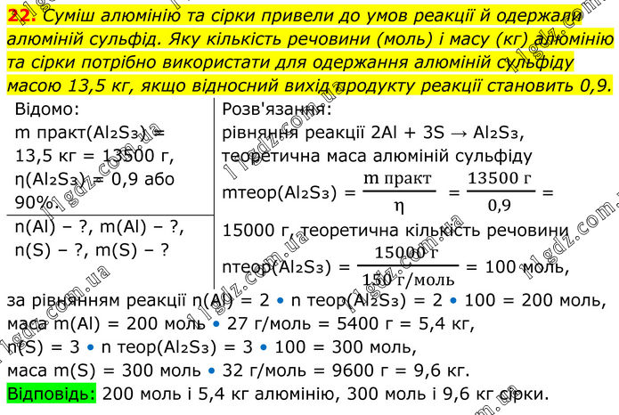 22. Суміш алюмінію та сірки привели до умов реакції й одержали алюміній сульфід. Яку кількість речовини (моль) і масу (кг) алюмінію та сірки потрібно використати для одержання алюміній сульфіду масою 13,5 кг, якщо відносний вихід продукту реакції становить 0,9. Відомо: m практ(Al₂S₃) = 13,5 кг = 13500 г, η(Al₂S₃) = 0,9 або 90%. Розв'язання: рівняння реакції 2Al + 3S → Al₂S₃, теоретична маса алюміній сульфіду mтеор(Al₂S₃) = (m практ )/( η ) = (13500 г )/(0,9 ) = 15000 г, теоретична кількість речовини nтеор(Al₂S₃) = (15000 г )/( 150 г/моль ) = 100 моль, n(Al) – ?, m(Al) – ?, n(S) – ?, m(S) – ? за рівнянням реакції n(Al) = 2 • n теор(Al₂S₃) = 2 • 100 = 200 моль, маса m(Al) = 200 моль • 27 г/моль = 5400 г = 5,4 кг, n(S) = 3 • n теор(Al₂S₃) = 3 • 100 = 300 моль, маса m(S) = 300 моль • 32 г/моль = 9600 г = 9,6 кг. Відповідь: 200 моль і 5,4 кг алюмінію, 300 моль і 9,6 кг сірки.