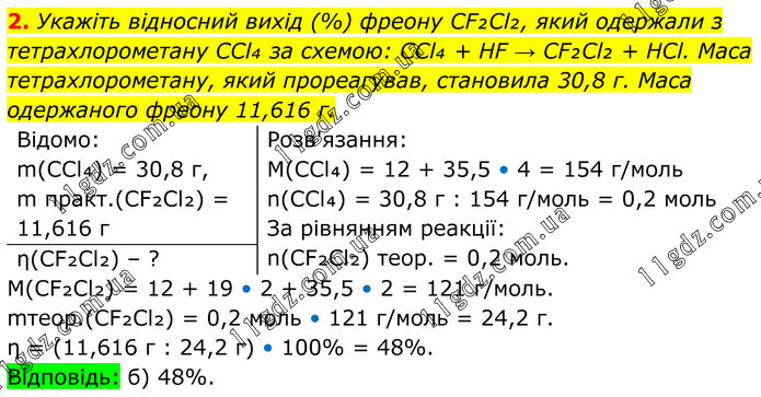 2. Укажіть відносний вихід (%) фреону CF₂Cl₂, який одержали з тетрахлорометану CCl₄ за схемою: CCl₄ + HF → CF₂Cl₂ + HCl. Маса тетрахлорометану, який прореагував, становила 30,8 г. Маса одержаного фреону 11,616 г. Відомо: m(CCl₄) = 30,8 г, m практ.(CF₂Cl₂) = 11,616 г Розв'язання: M(CCl₄) = 12 + 35,5 • 4 = 154 г/моль n(CCl₄) = 30,8 г : 154 г/моль = 0,2 моль За рівнянням реакції: n(CF₂Cl₂) теор. = 0,2 моль. η(CF₂Cl₂) – ? M(CF₂Cl₂) = 12 + 19 • 2 + 35,5 • 2 = 121 г/моль. mтеор.(CF₂Cl₂) = 0,2 моль • 121 г/моль = 24,2 г. η = (11,616 г : 24,2 г) • 100% = 48%. Відповідь: б) 48%.
